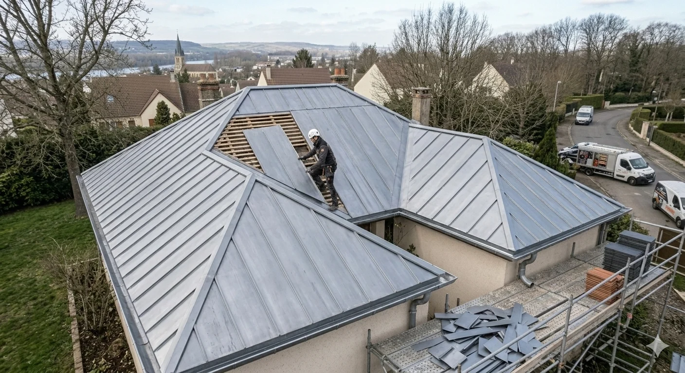 Le zinc nécessite une ventilation spécifique pour éviter la condensation en sous-face. Il est impératif de le poser sur un voligeage en bois (sapin ou peuplier) avec un espace d’air suffisant. Nous vérifions systématiquement la compatibilité de votre structure avant la pose.